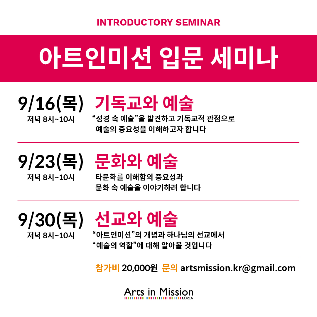 예술과 선교에 대한 기초적인 이해를 돕기 위한 <아트인미션 입문 세미나>를 개최합니다.