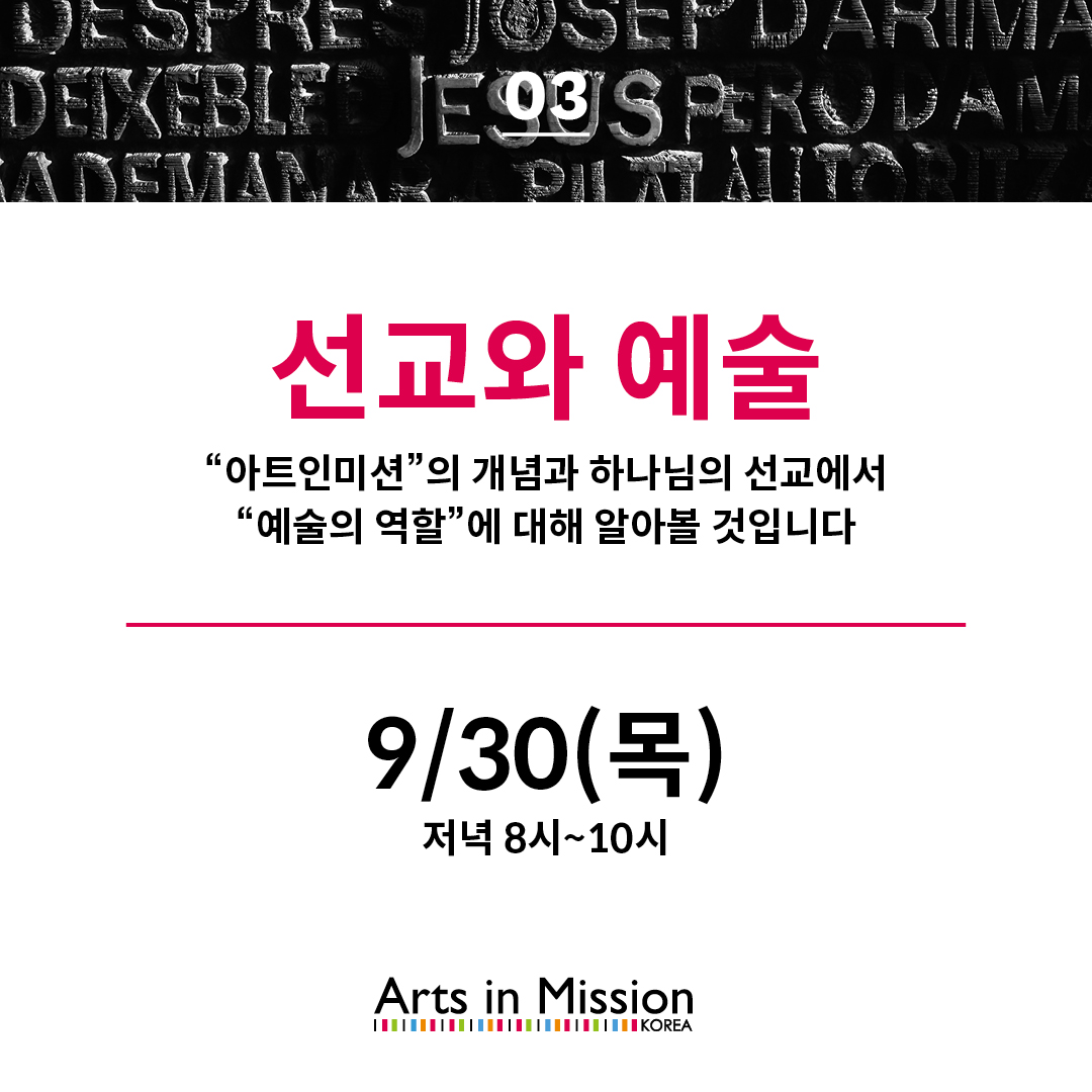 3) 9/30(목) 저녁 8시~10시 <선교와 예술>